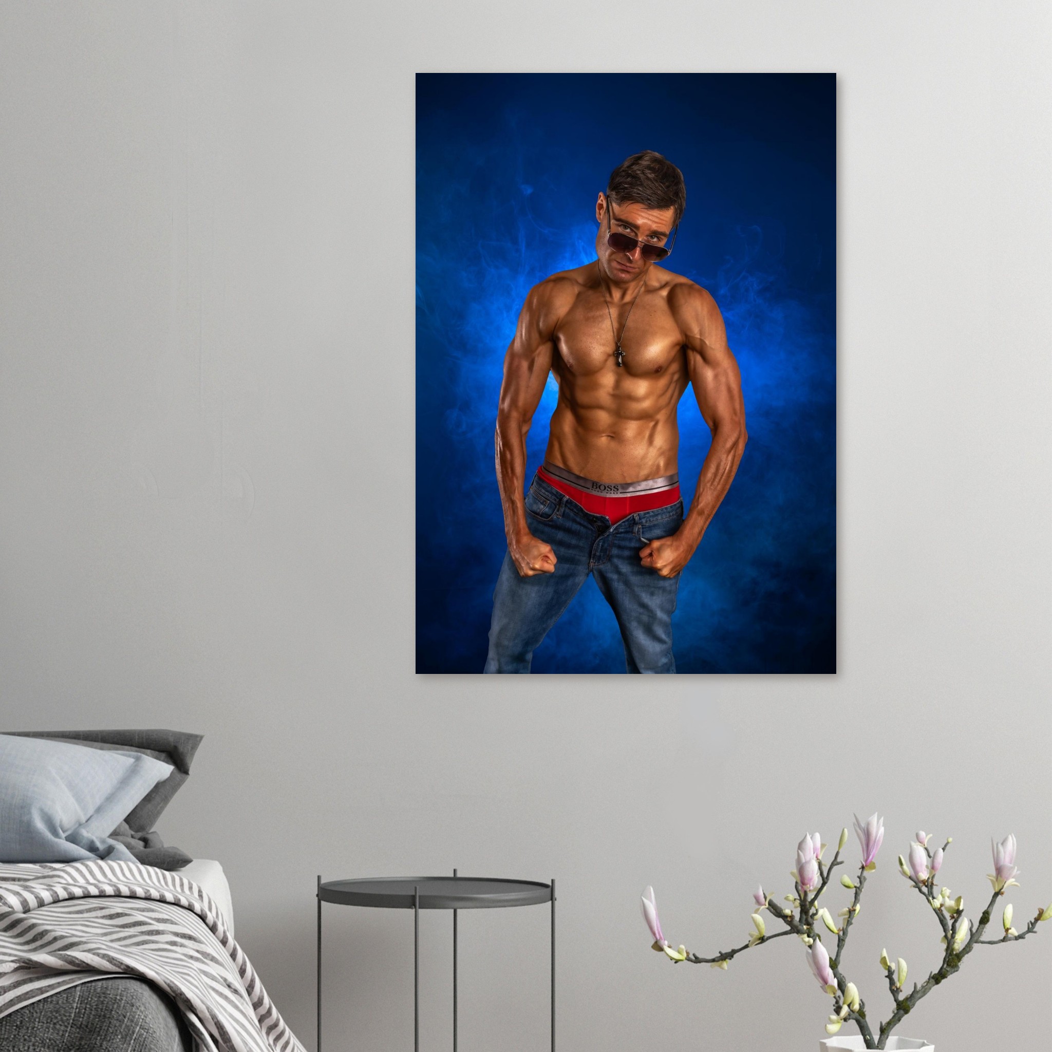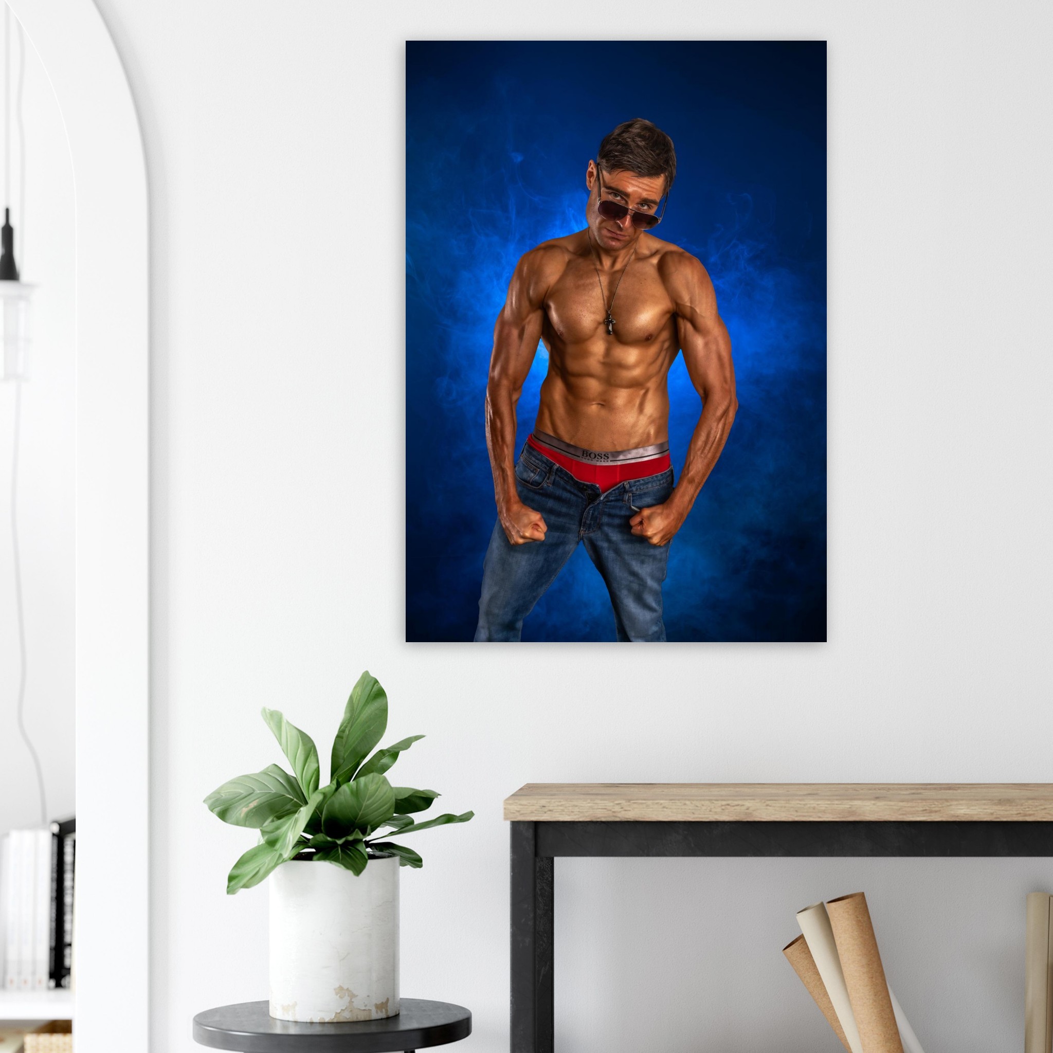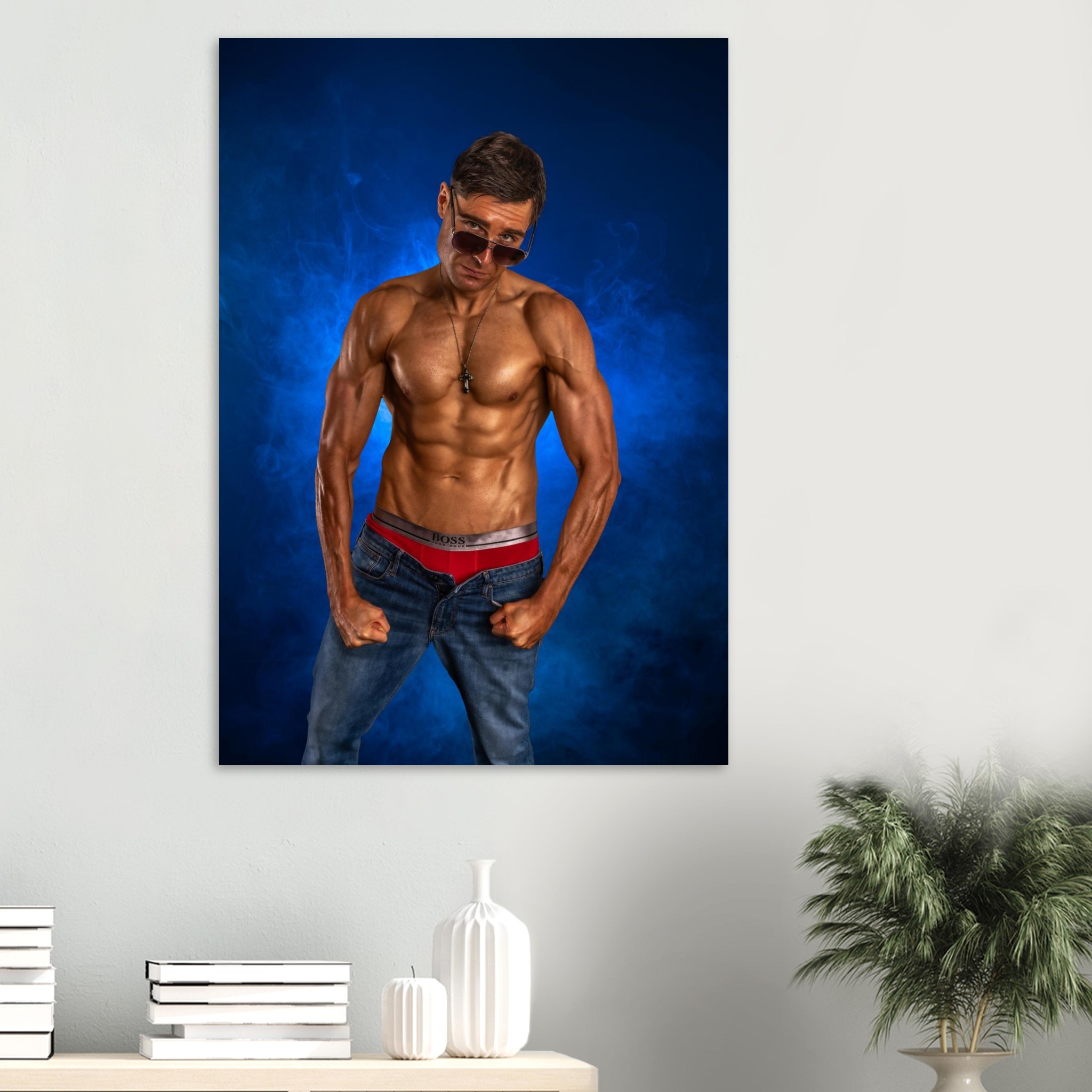 “Blue Smoke” captures Ed Akay in a powerful physique pose, highlighted by vibrant blue smoke that lifts the image with a dramatic, atmospheric energy. With defined musculature, a confident stance, and a cool stare over his sunglasses, this portrait blends strength, style, and striking colour for a bold contemporary aesthetic.