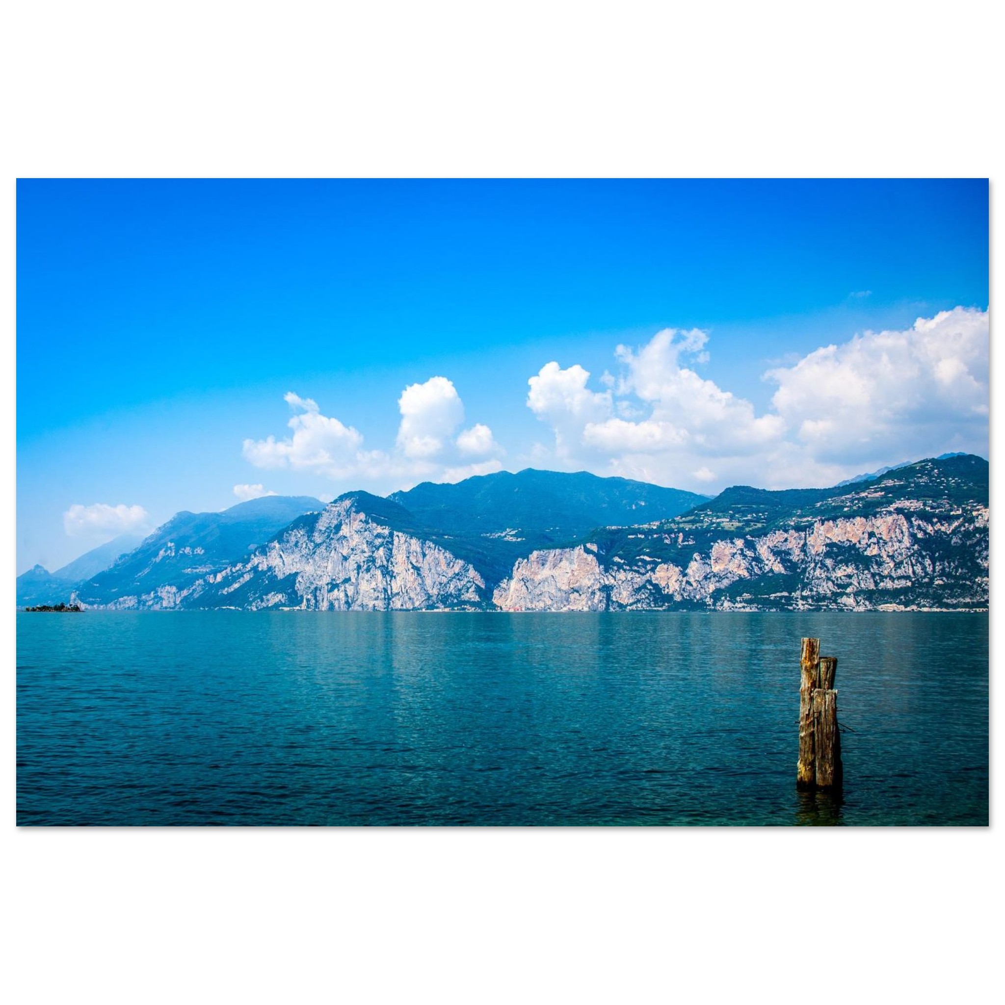 The tranquil shores of Lake Garda in Malcesine, Italy, showcase a stunning contrast between the sharp mooring post in the foreground and the soft, cloud-topped layers of the distant mountains under a vivid blue sky. The landscape exudes peace and serenity, inviting viewers to immerse themselves in the breathtaking scenery of this Italian gem.