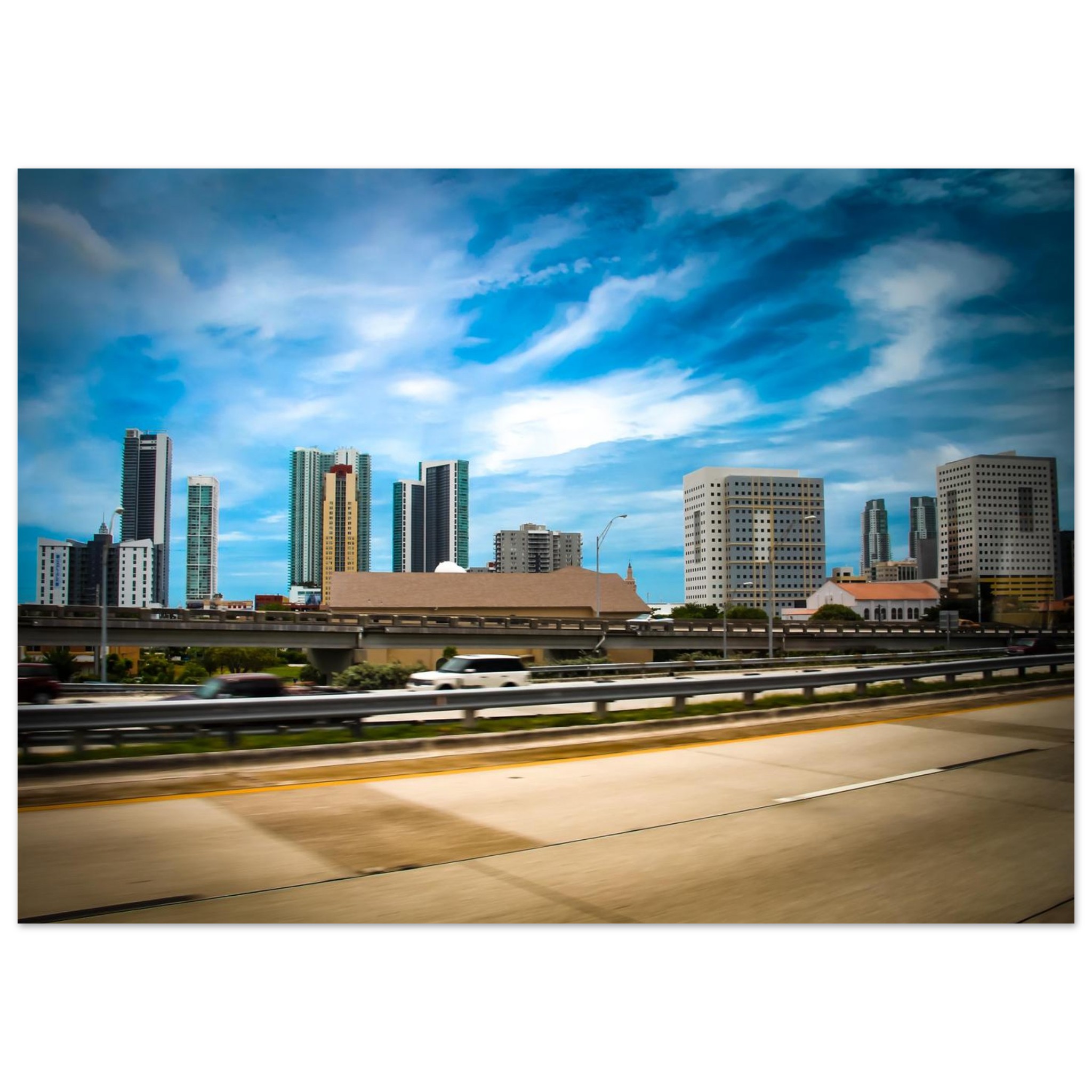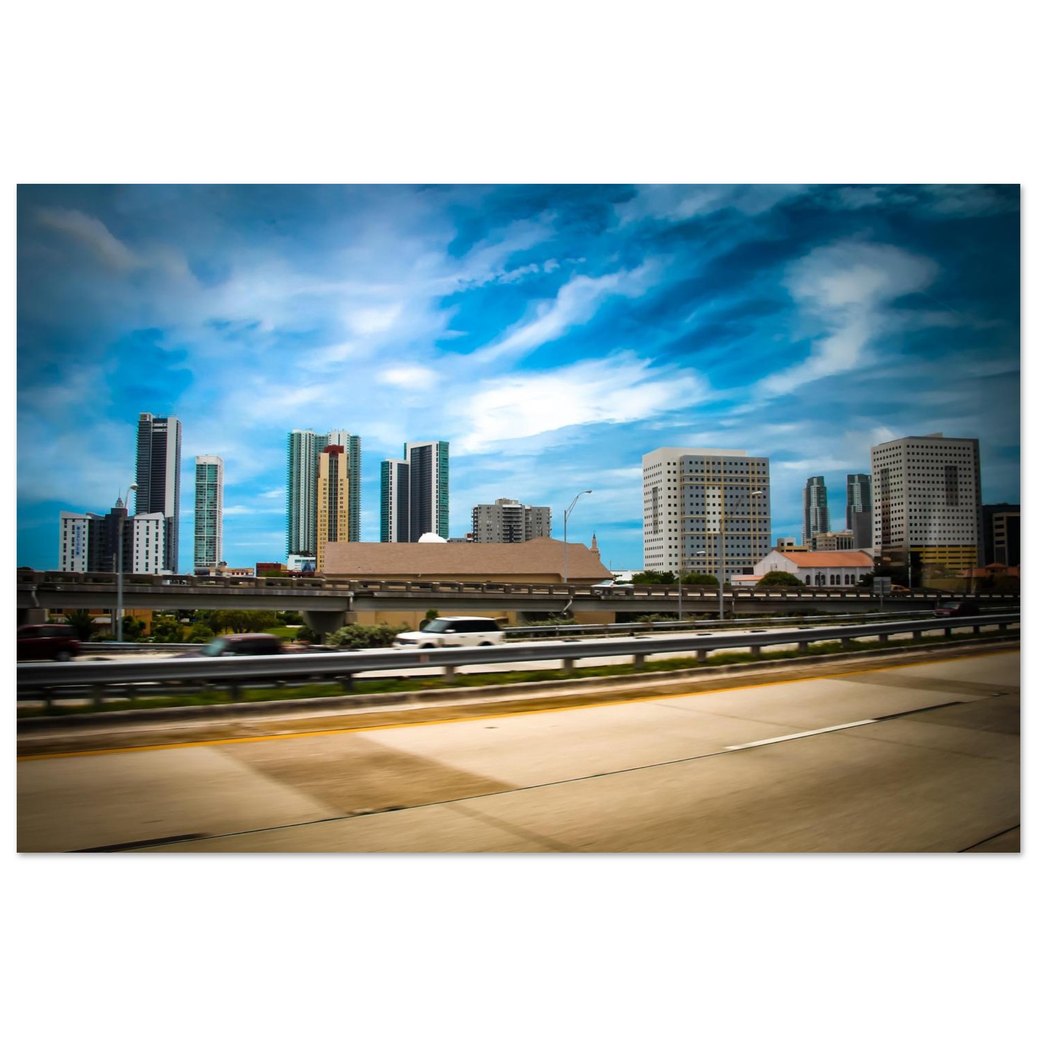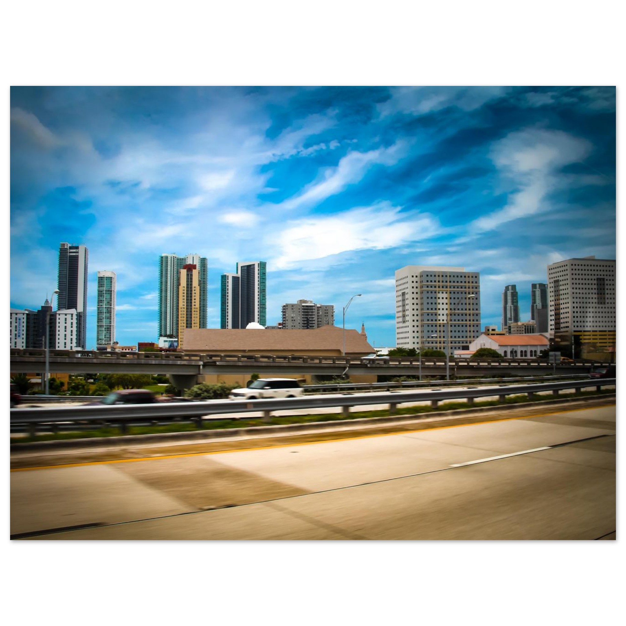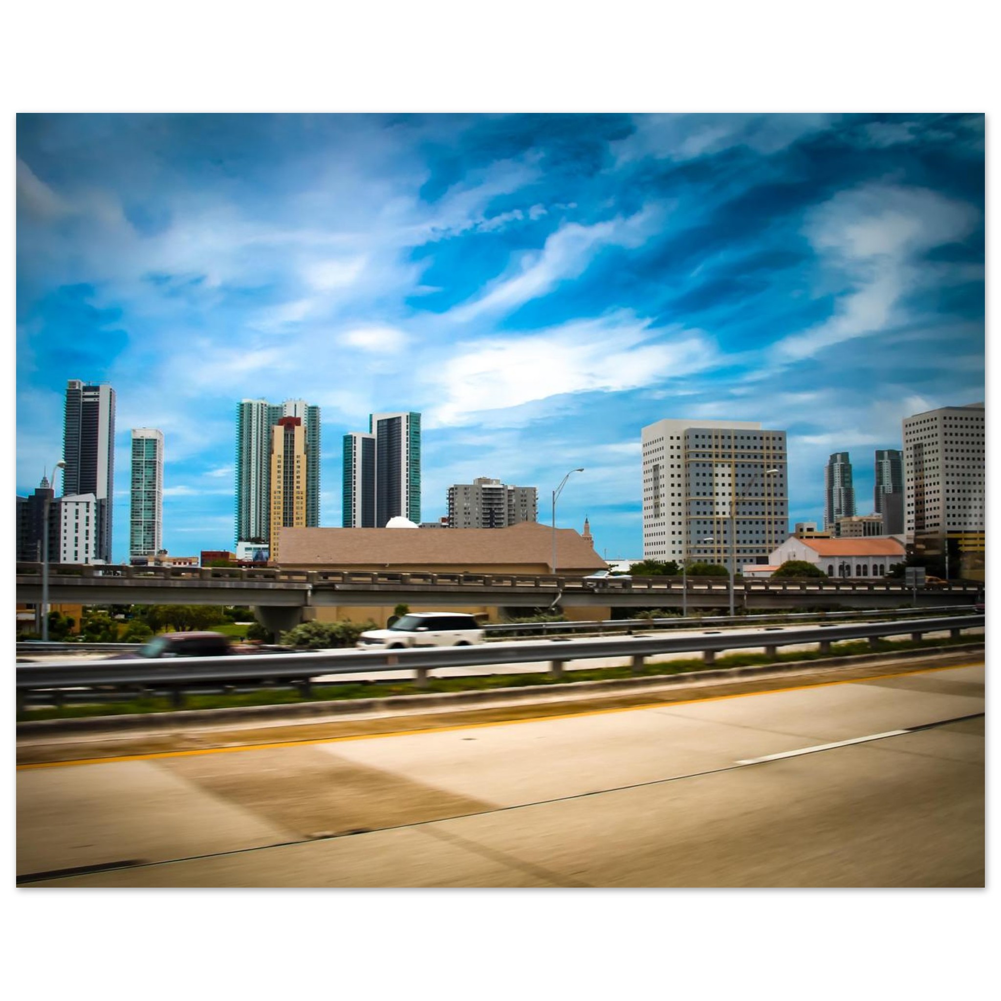 The vibrant Miami skyline, frozen in time in 2012, showcases the golden tower and perforated office blocks standing out against the blurry movement of the road. This cityscape picture was taken from I-95 over NW 10th St, Miami, United States, capturing the architectural beauty of the city before its major building boom transformed it.