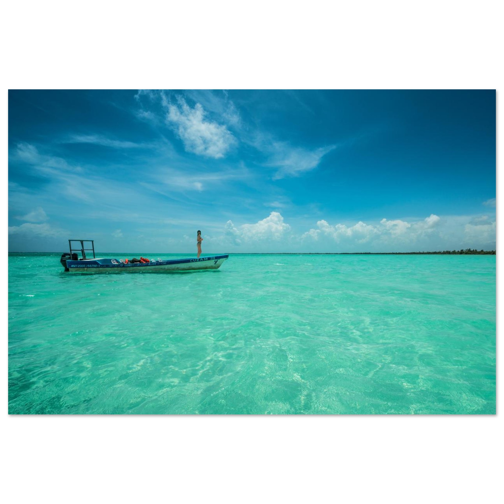The crystal clear, turquoise waters of Sian Ka’an Biosphere Reserve in Bacalar, Mexico, create an atmosphere of perfect tranquility. A woman stands on a boat to give detail and depth to this perfect frame. The vibrant blue sky above gives perfect balance to the water. This picture captures the essence of the Caribbean Sea’s allure, with its pristine turquoise waters and stunning natural landscapes.